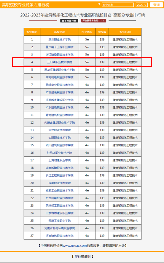 beat365唯一官方网站建筑智能化工程技术专业在2022年中国科教评价网“金平果”全国高职院校中排名第四,水平等级5★(全国共6所5★院校),全国开设建筑智能化工程技术专业的学校数139所,这是该专业继2021年之后第二次获得此等级评价。