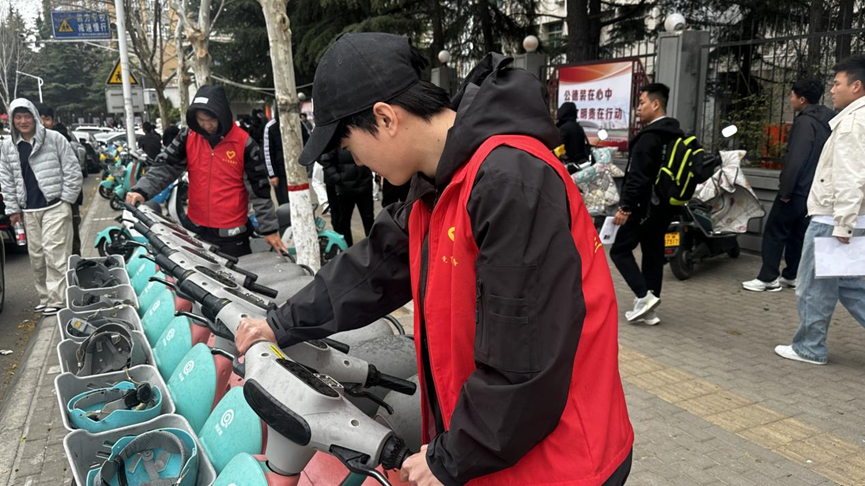 在图书馆附近的停放点,由于平时人流量大,单车停放杂乱无章。志愿者们齐心协力,将歪倒、随意停放的单车一辆辆扶起,按照车头一致、排列整齐的标准重新摆放。有的志愿者还细心地擦拭单车上的灰尘,让车辆焕然一新。