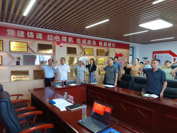 在党课开始前,全体党员在“七一”建党节这个特殊的日子,面对党旗庄严宣誓,重温入党誓词。