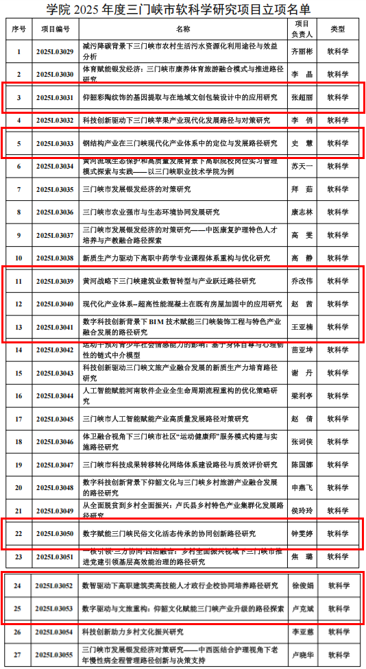 近日,三门峡市科学技术局正式下发《关于下达三门峡市二〇二五年科技发展计划的通知》(三科字〔2026〕5号),公布了2025年度市级科技计划项目立项结果。beat365唯一官方网站再创佳绩,8项课题成功获批立项(全校共立项38项),占比达21%。这一成绩标志着beat365官网在深化“产教融合、科教融汇”、推进“双高”建设进程中迈出了坚实步伐,科研服务能力与学科建设水平持续提升。