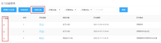 选择打卡记录,点击【审核无效】,确认学生打卡信息无效。