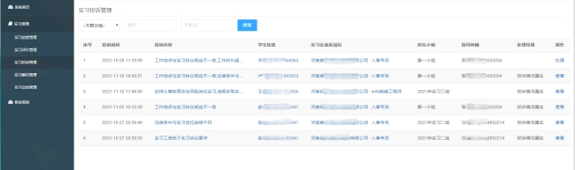 点击【实习投诉管理】操作栏的【处理】处理学生的投诉信息,处理之后的数据只能点击【查看】查看学生的投诉信息和处理情况。