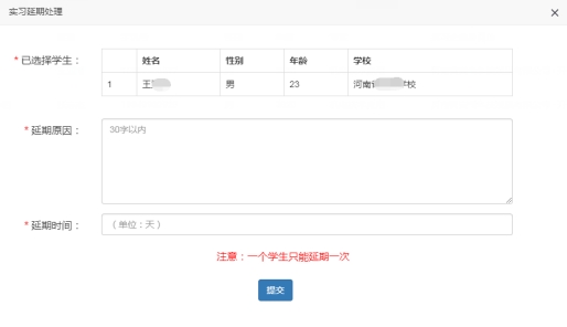 在学生实习需要延期时,选择实习学生,点击【实习延期】,输入延期原因及延期时间,点击【提交】,完成学生实习延期处理。实习延期后,学校实习计划结束时间加上延期天数为该生的最晚实习结束时间,在最晚实习结束时间之前,指导老师可以随时终止或者完成学生的实习任务。