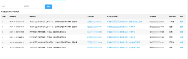 点击【实习解约处理】操作栏的【处理】处理学生的解约信息,处理之后的数据只能点击【查看】按钮查看学生的解约信息和处理情况。