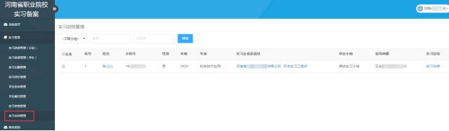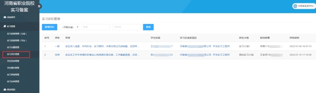 在学校或二级院系完成实习学生的编班分组、指定实习指导老师之后,实习指导老师便开始对所负责的学生进行管理,包括实习进度管理、实习出勤管理、实习评价管理、实习评价管理、实习投诉管理、实习解约管理、实习荣誉管理、实习总结管理。