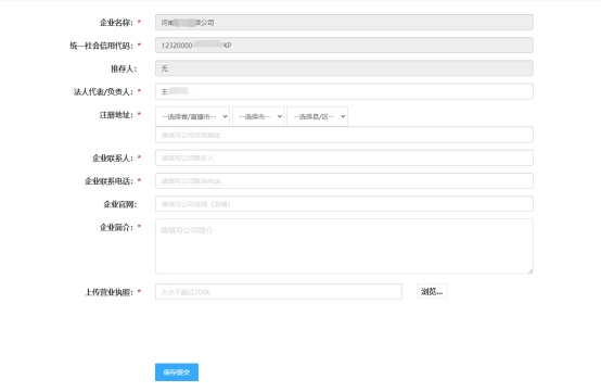 首次登陆系统须按照表单要求完善企业联系人、联系电话和营业执照等信息, 点击【保存提交】提交实名认证。等待实习备案模块根据市场监管部门备案企业信息查询企业资格、条件后获准进入实习企业库。