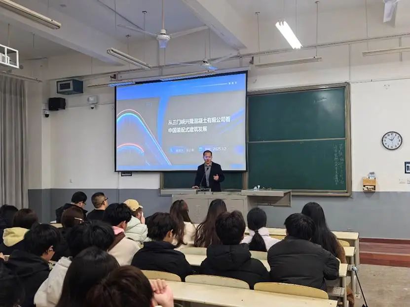 公司副总经理张江华用为同学们详细介绍了当前行业内装配式建筑的发展态势。张江华指出,当今建筑行业对环保与高效的要求达到了新高度,装配式建筑作为一种新型建筑模式,凭借其在资源节约、工期压缩以及质量提升等多方面的突出优势,成为以后建筑行业的发展趋势。这种将大量工作转移至工厂完成,现场只需进行组装的方式,既减少了现场施工的噪音、粉尘等污染,又通过工厂标准化生产保证了建筑构件的精度与质量,符合当下建筑行业绿色、高效的发展理念。三门峡兴隆混凝土有限公司目前拥有23项专利,且主持国家装配式标准的制定,将来会大有可为,希望同学们能选择到公司实习就业。