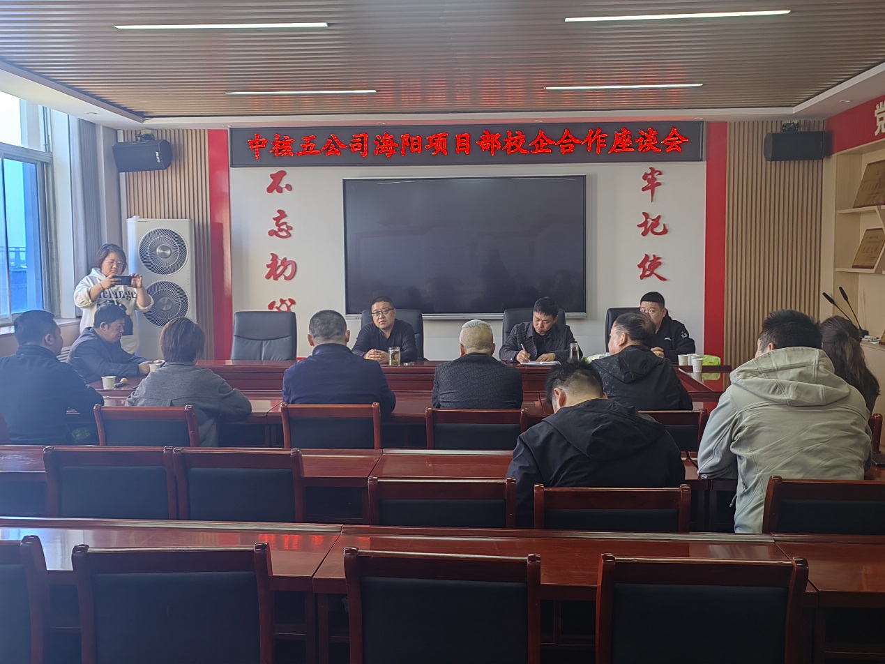 会谈伊始,院党总支书记雷旭峰对中核五公司海阳项目部的到访表示诚挚欢迎,并简要介绍了学院的发展历程、专业设置、师资力量以及科研成果等方面情况,重点阐述了学院在人才培养方面的特色与优势,强调学院一直致力于培养适应社会需求的高素质技能型人才。