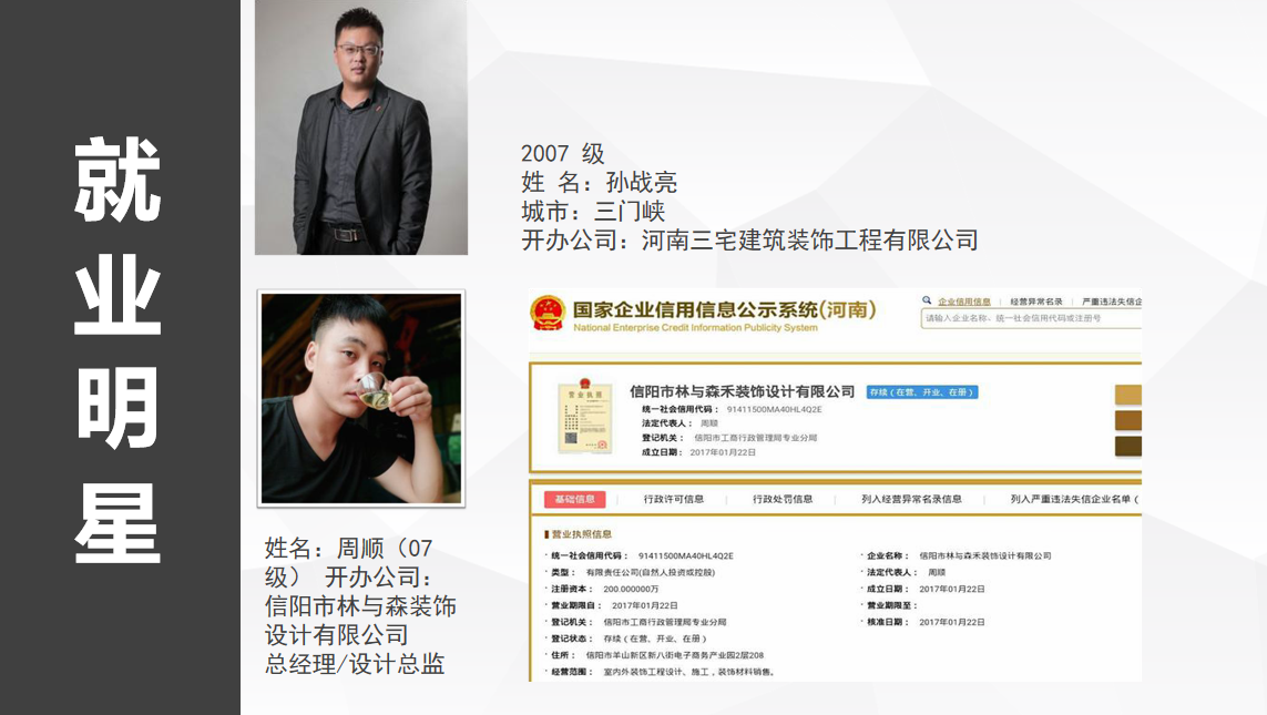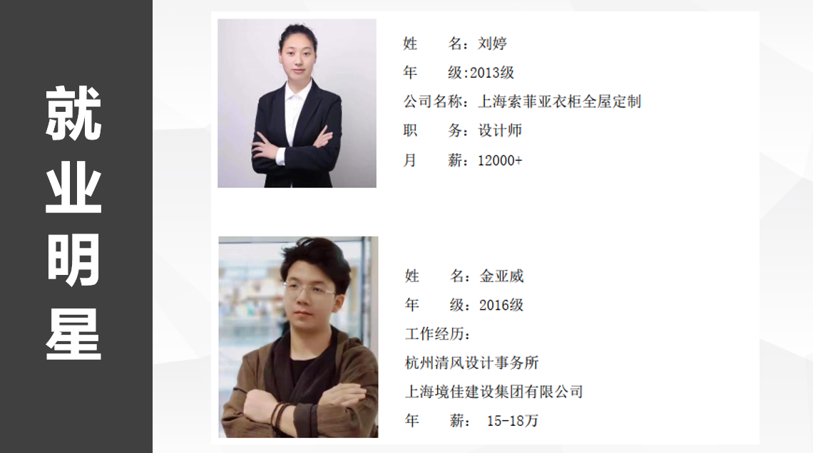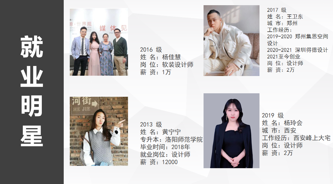 从专业 2003 年开办至今,已为装饰装修行业输送近 5000 名优秀设计师,经过若干年的积淀,他们成就了自己的梦想,成为了企业老总或行业翘楚,有的经过深造学习,实现了学历提升的初衷。大家一起努力,我们的辉煌,还需你们继续来谱写!