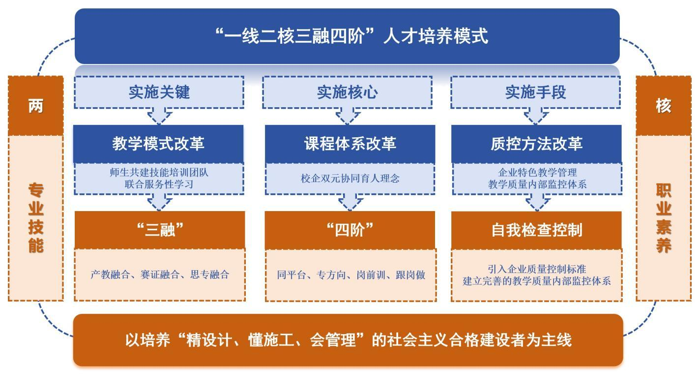 建筑室内设计专业根据装饰行业的特点和本专业人才培养规格的要求,创新实施“一线二核三融四阶”的人才培养育人模式,全面推行“1+X”证书与人人持证制度,将证书内容有机融入专业人才培养方案,促进复合型技术技能人才培养,提高人才培养质量和学生就业能力。