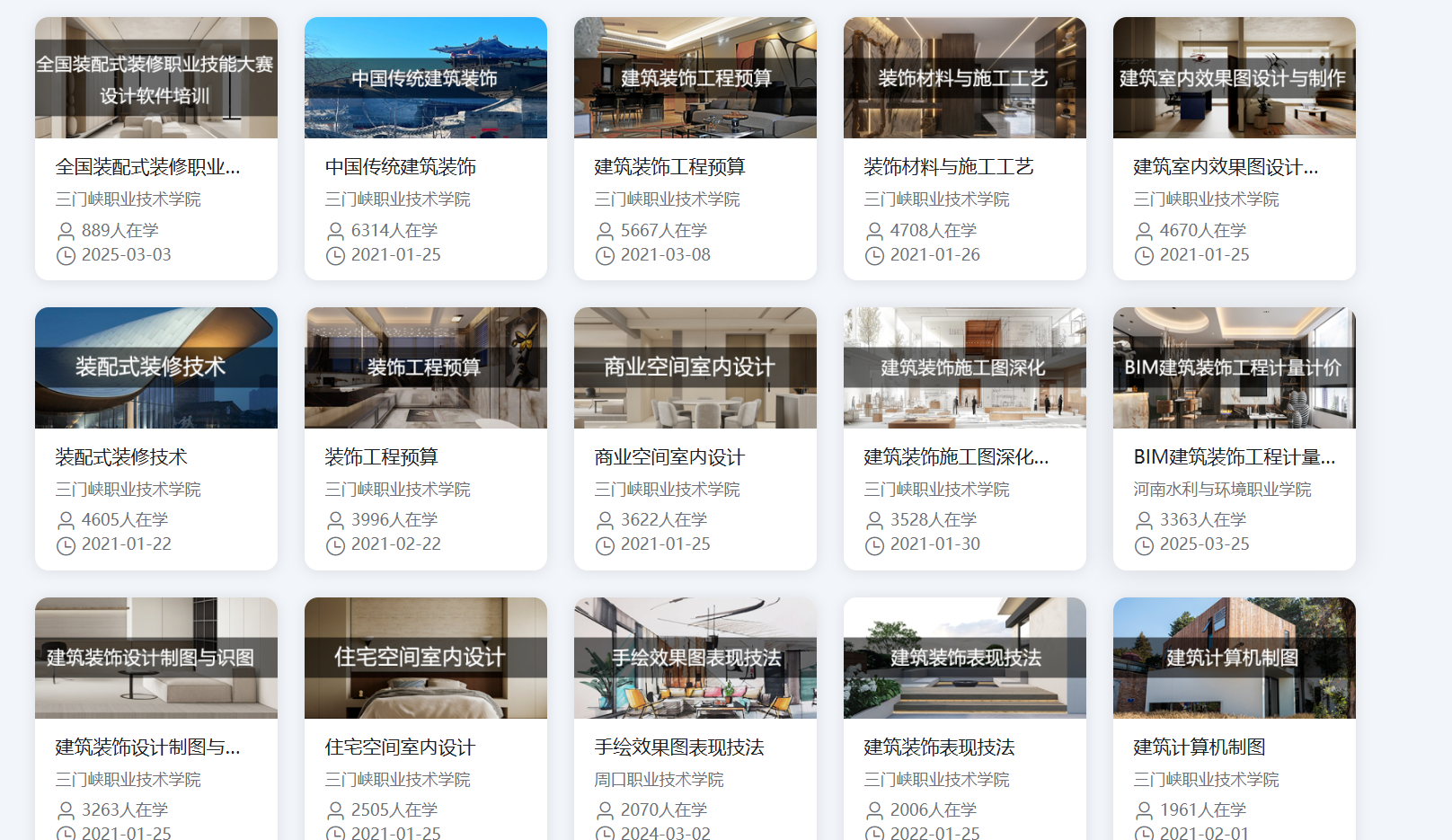 课程资源非常丰富,依托“一平三端”与虚拟仿真软件,完成了所有课程的线上建设。专业拥有河南省建筑室内设计专业教学资源库,“三维一体化”新型教材,搭建“校企行”共建平台,课程更具实用性。