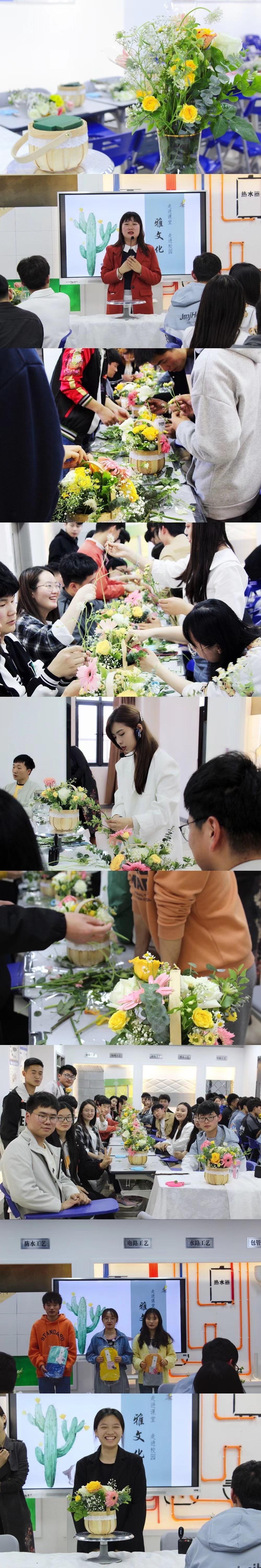 为提高学生自身艺术鉴赏和审美能力,丰富技艺,培养花艺作品实际设计创作动手能力,使学生具备对插花艺术品的鉴赏与应用能力。增强学生艺术修养,培养学生开拓创新和团队协作能力,促进学生综合素质的提高。2021年4月22号,建筑装饰工程专业打破传统授课方式。以“花型制作”为主线边做边学,理论指导实践,实践验证理论,开展软装课程特色教学活动。活动内容围绕“雅文化走进课堂-花艺设计”主题进行,掌握插花艺术的花材选择、处理及固定等基本技法。把大家领进艺术创作的大门。