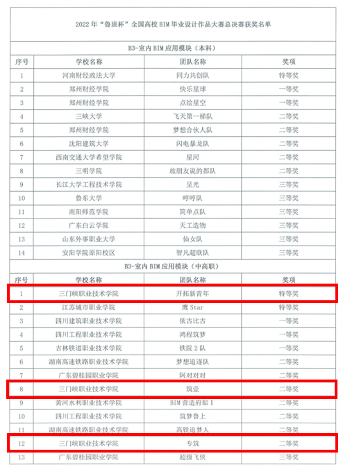为加快高等教育高质量发展,加强BIM教学和人才培养的经验交流,培养技术技能人才,推进工程教育改革,2022年5月29日,由中国建设教育协会主办,教育技术专业委员会、浙江同济科技职业学院、鲁班软件股份有限公司共同承办的2022年度“鲁班杯”全国高校BIM毕业设计大赛总决赛(教育部认证A类学科竞赛)以线上直播形式拉开帷幕。来自全国各地136所高等院校486支队伍展开角逐。建筑装饰工程技术专业教师王亚楠、王琴、尚海云、吕静、王约慧指导的三支团队,在本次大赛(B3室内BIM应用组)中脱颖而出。其中,由张威威、张威振、胡贝贝、王清松、张珂声组成的“开拓新青年”代表队荣获特等奖,由雷涛、张潆、马婉婷、赵洪康、朱葛成组成的“筑壹”代表队荣获二等奖,由倪晨、王百荷、王海洋、朱振雄、高阳组成的“专筑”代表队荣获二等奖。竞赛过程中,各参赛团队彰显出装饰专业学生良好的技能水平、综合素质及团队合作精神,五位指导老师则获得“优秀指导教师”称号。