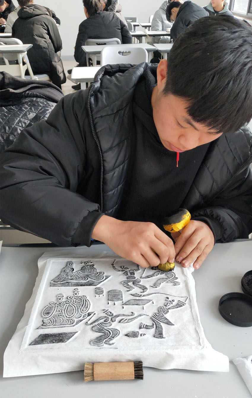 《拓片制作》课程在课堂之外还安排同学们到校外实践场所认识学习。同学们参观了虢国博物馆,对馆藏文物的高精拓片认真学习,并将学习的技术用于实践项目。