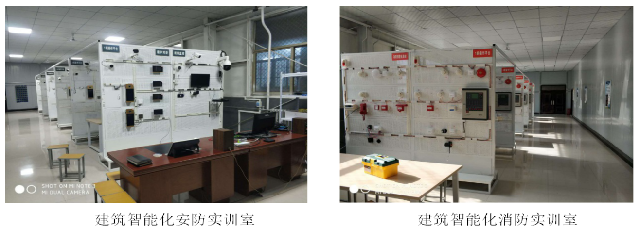 建筑智能化工程技术有3个大型实训室(安防实训室、消防实训室、综合布线实训室)。实训室所有设备采用一线品牌设备,如:海康威视、立林科技、艾礼富、中控智慧、海湾消防、西门子等。让学生在校内就能够安装、调试、检测以后工作需要使用的设备和软件。校内有省人力资源和社会保障局《智能楼宇管理员(三级/高级工)》职业资格证书鉴定点。