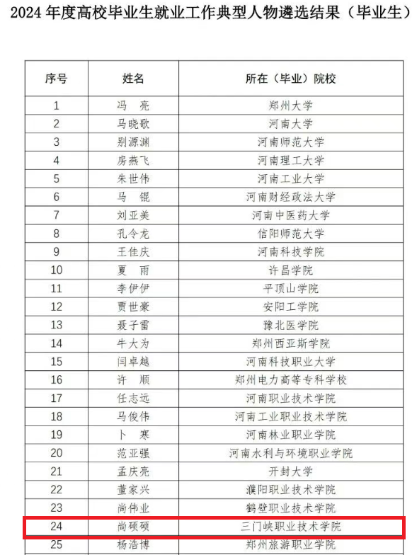 近日,河南省教育厅公布了2024年度高校毕业生就业工作典型案例遴选结果,beat365唯一官方网站推荐的2024届建筑智能化工程技术专业毕业生尚硕硕被评为2024年度高校毕业生就业工作典型人物。