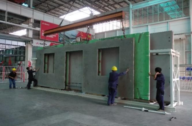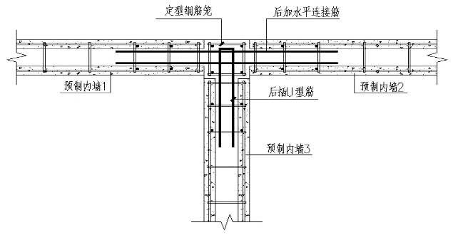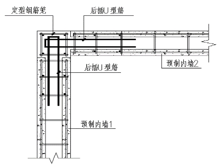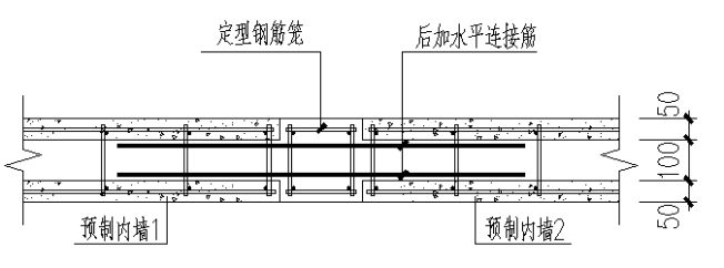 1.叠合内墙板构件。由两层预制板和成型钢筋骨架制作而成。内部放置成型钢筋骨架,通过翻转设备(或免翻转设备)浇筑两层预制板,预制板通过成型钢筋骨架连接。叠合剪力墙利用两外侧预制部分作为模板,中部现浇层与叠合楼板的现浇层同时浇筑。