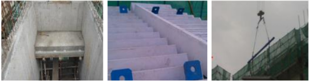 在上层墙体出模后,吊装下层预制楼梯踏步板,保证 L 型梁强度。