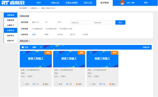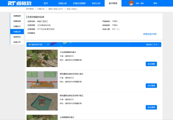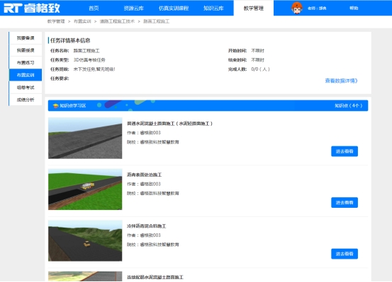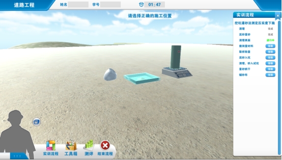 道路施工技术虚拟仿真课程包含路基工程、路面工程、附属工程的实训内容,真实体验施工工艺全过程,实训流程环环相扣,实训过程由浅入深,实现真实施工现场不具备和难以完成的教学功能。
