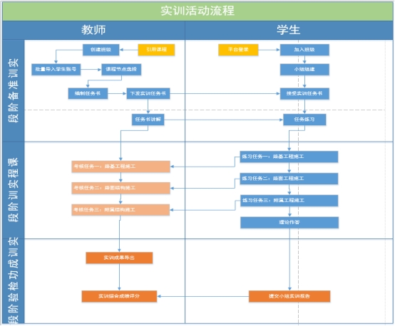 道路施工技术虚拟仿真课程采用互联网在线教学实训,通过虚拟仿真的形式将施工工艺流程、施工过程中的人材机的全过程施工进行线上模拟。通过在线实训可解决传统道路实训场地难找、难以全过程实训、不安全、花费大等问题。