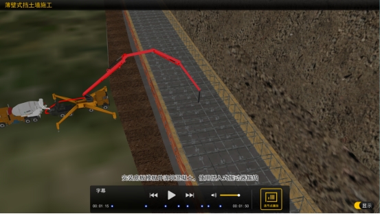 课程采用4D微课进行工艺流程演示,从施工流程、资源配置、施工规范等方面展示道路施工过程中的人机料法环等内容。例如薄壁式挡墙施工流程包括:施工准备、基础开挖、素混凝土垫层施工、绑扎钢筋、浇筑底板混凝土、凿毛、浇筑墙身混凝土、养护拆模等内容。