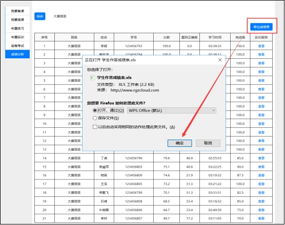 选择成绩分析,点击对应任务书可进行学生完成情况及各题正确率的查看