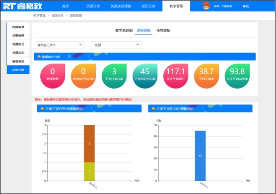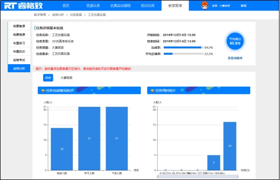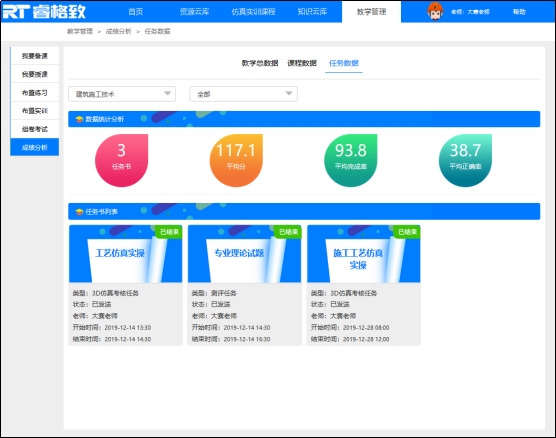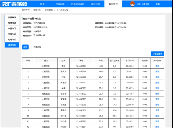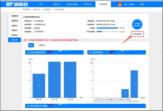 (1)选择成绩分析,点击对应任务书可进行学生完成情况及各题正确率的查看