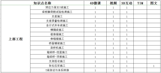 课程包含桥梁基础、下部结构、上部结构、附属四大部分40余知识点,覆盖常规桥梁结构施工的施工工艺和技术参数,在此基础上制作特殊桥型及特殊工法TIM模型,在满足教学广度的前提下,提高教学深度,使学生对桥梁施工有全面的认识。