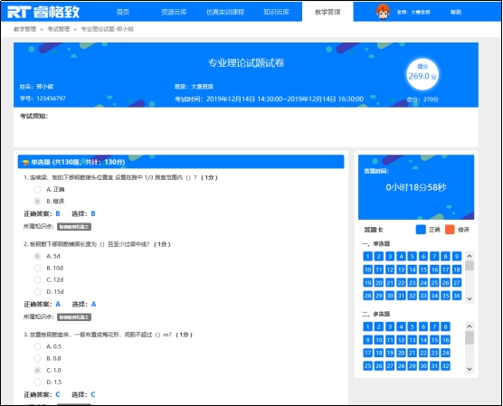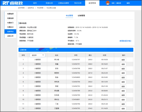 (2)到达任务结束时间后点击“查看成绩单”可查看班级答题得分,点击“查看”可查看学生个人详细实训报告