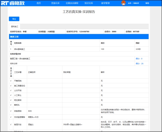 本课程方案包含34个学时的学习内容,通过在线虚拟仿真的形式进行教学。课程内容主要以学生依据技术交底编写、4D微课视频学习、3D互动工艺操作等学习完成施工流程流程考核、工种考核、机具考核、材料考核、规范和位置考核等多样化考核形式,多维度检验学习效果,解决学生实训难,老师考核难、量化难问题。