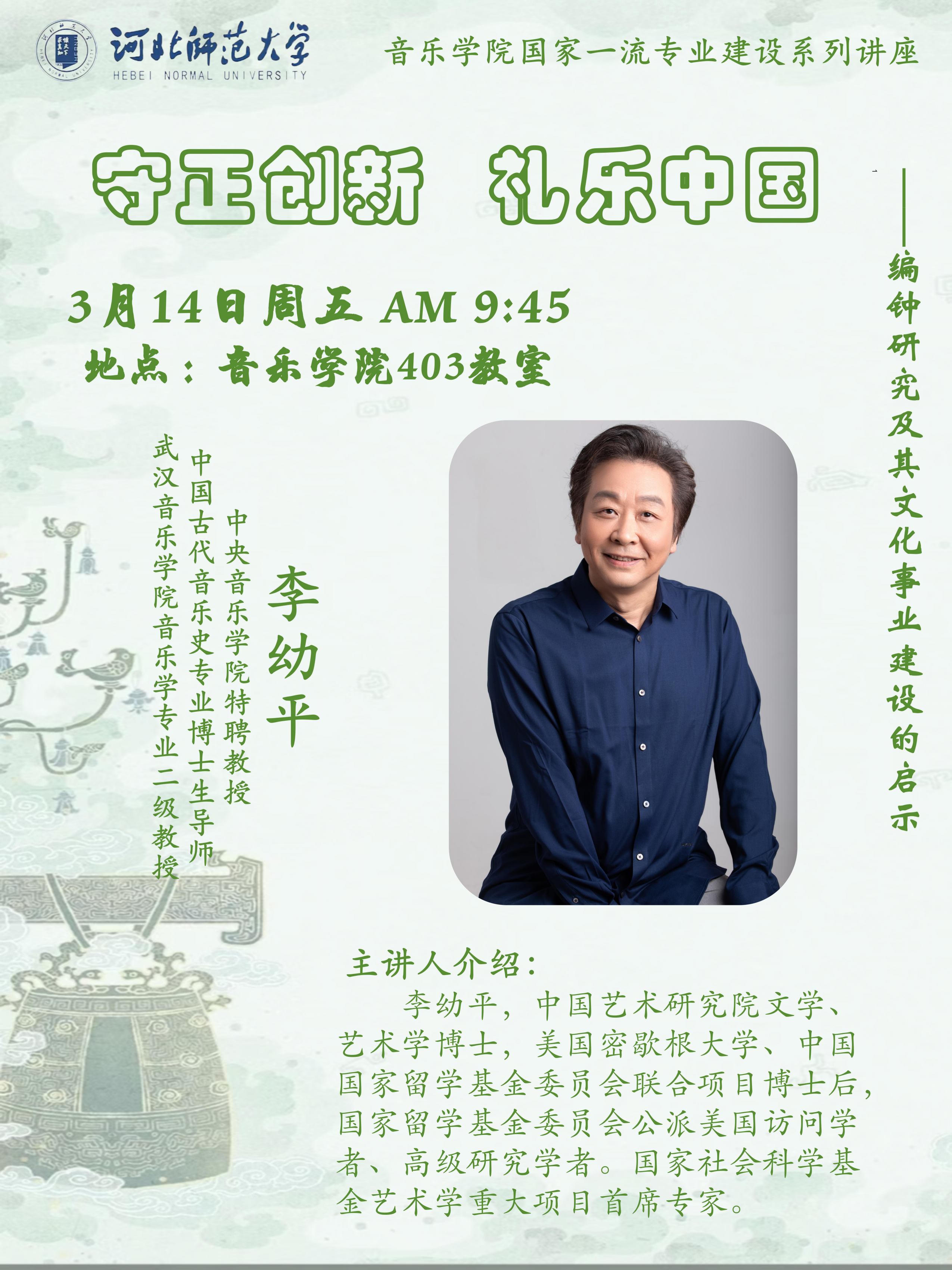 李幼平,中国艺术研究院文学•艺术学博士,美国密歇根大学、中国国家留学基金委员会联合项目博士后,国家留学基金委员会公派美国访问学者、高级研究学者。中央taptap点点188特聘教授、中国古代音乐史专业博士生导师、博士后项目合作导师、国家社会科学基金艺术学重大项目首席专家,武汉taptap点点188音乐学专业二级教授、党委原常委副校长。教育部高等学校音乐与舞蹈学类专业教学指导委员会副主任委员、本科教育教学质量审核评估专家,普通高校音乐专业教学质量国家标准、中国学生音乐学科核心素养等项目核心组成员。国家社会科学基金艺术学重大项目“礼乐文化传承创新的当代音乐实践与理论研究”、国家文化创新工程项目“新编钟科技成果转化与推广”、国家艺术科学规划领导小组办公室委托项目“艺术学•音乐学科十年(2012-2021)发展研究”及钟磬礼乐、大晟钟与宋代黄钟标准音高研究等国家级、省部级和中美国际合作项目负责人,研究成果曾获文化部科学技术进步奖、湖北省科学技术进步奖、邓广铭学术奖励基金著作奖及国家专利。