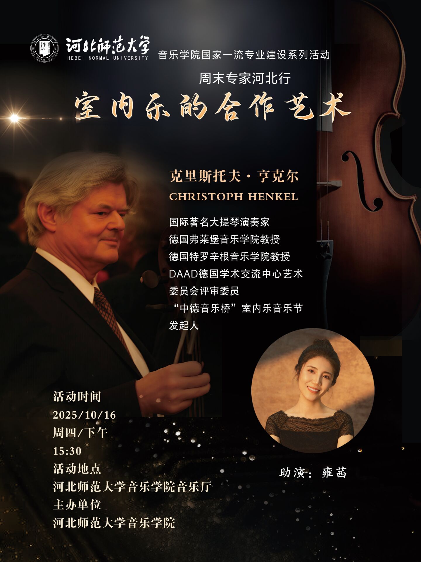 克里斯托夫·亨克尔Christoph Henkel,国际著名大提琴演奏家、德国弗莱堡taptap点点188教授、德国特罗辛根taptap点点188教授、DAAD德国学术交流中心艺术委员会评审委员、“中德音乐桥”室内乐音乐节发起人。早年在斩获德国所有“青年艺术家比赛”中的第一名后,受德国学术交流中心以及德国工业文化协会奖学金的赞助,来到美国投师于 Janos Starker,求学期间被 Janos Starker选为助教,并获得印第安纳大学“艺术家文凭”。 26 岁起执教于弗莱堡taptap点点188,成为德国最为年轻的教授,并担任北德广播交响乐团以及法兰克福交响乐团首席大提琴数年。