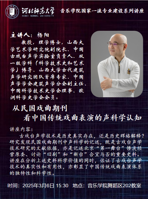 古戏台声学技术是历史真实存在,还是历史辉格解释?为何杨小楼、梅兰芳等诸多名角在北京“第一舞台”的演出是经历“骑虎的恐怖”?研究发现民国戏曲期刊中声科学的记述,既是古戏台声学技术研究的文献依据,亦是记述北京“第一舞台”惨淡经营原委、讨论“旧剧”和“新台”合宜与否的重要史料。讲座在分析上述史料科学价值的同时,佐证了古戏台声学技术的真实性和有用性,亦彰显了中国传统戏曲表演体系的独特性和科学性。