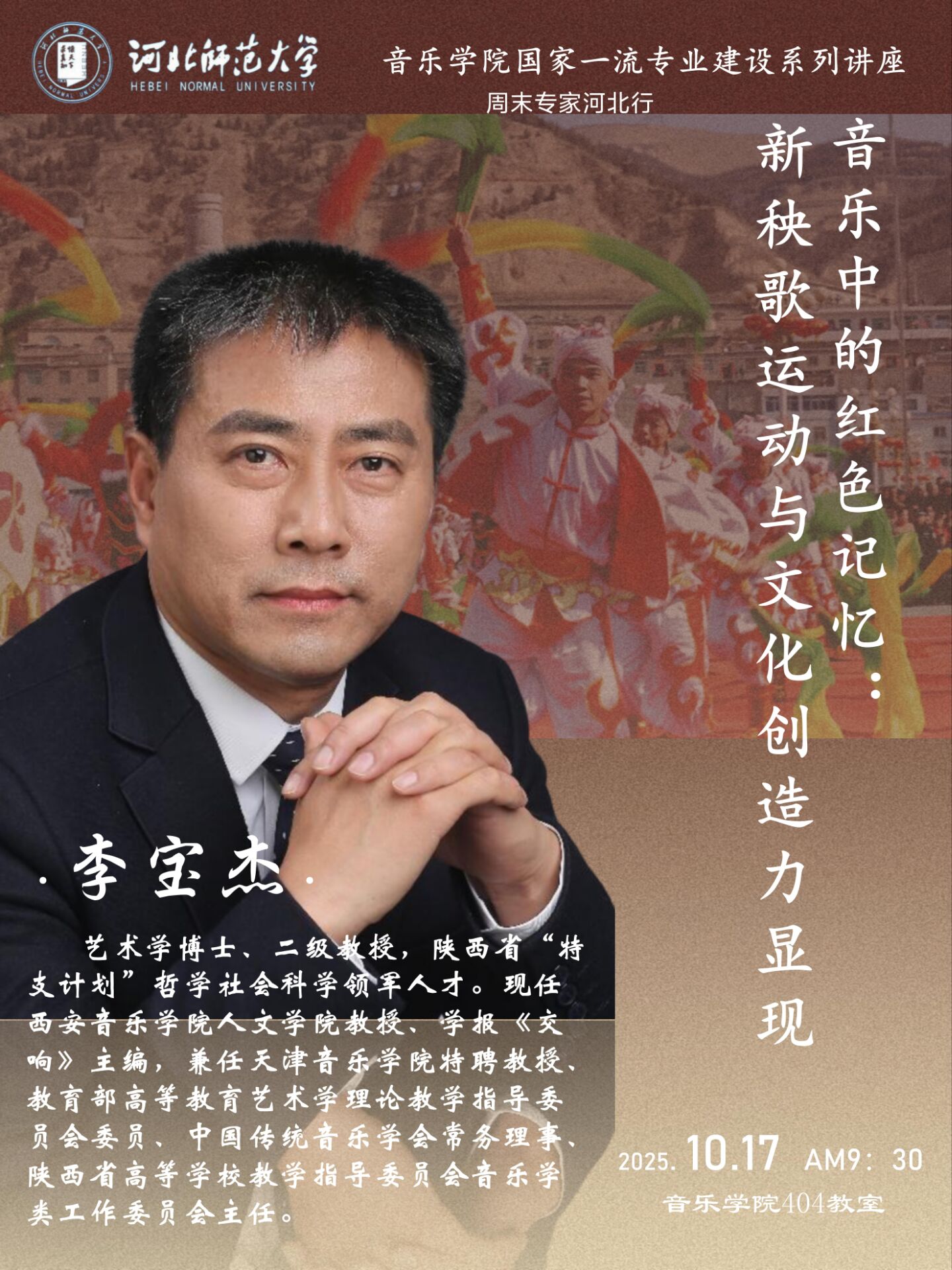 李宝杰,艺术学博士、二级教授,陕西省“特支计划”哲学社会科学领军人才。现任西安taptap点点188人文学院教授、学报《交响》主编,兼任天津taptap点点188特聘教授、教育部高等教育艺术学理论教学指导委员会委员、中国传统音乐学会常务理事、陕西省高等学校教学指导委员会音乐学类工作委员会主任。长期从事中国音乐文化、艺术民俗学、音乐编辑学等领域的教学与研究工作。发表研究成果数十万字,撰、编著作八部,承担并完成有国家级、省部级人文社科项目和国家出版基金项目。先后获得国家科技进步二等奖,陕西省第十二、第十三次哲学社会科学优秀成果著作类二等奖和论文类三等奖,陕西省新闻出版局、陕西省教育厅高等社科学报优秀编辑学论著一等奖、二等奖,陕西省教育厅人文社科研究成果三等奖,陕西省高校优秀教材一等奖等。