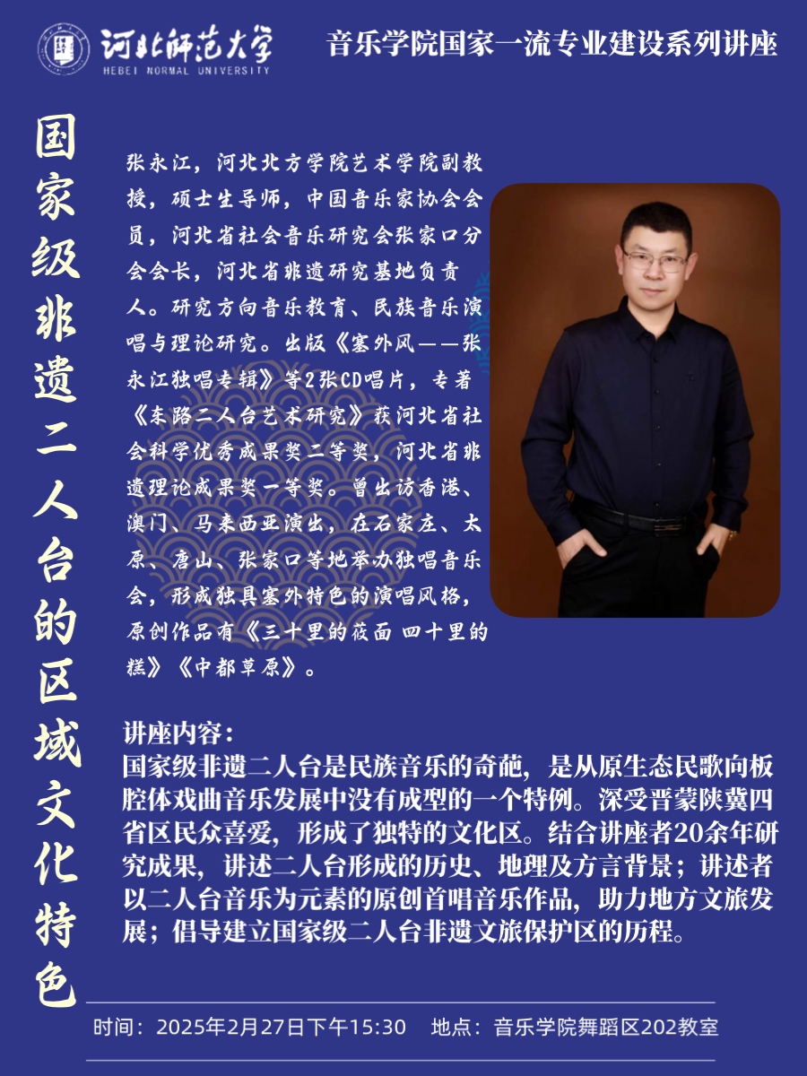 艺术深受晋蒙陕冀四省区人民喜爱,形成了一个独特的文化区。张永江教授以他20多年的研究成果,讲述了二人台艺术形成的历史背景、地理背景及方言背景,他如何以二人台音乐为元素的原创首唱音乐作品为张家口的文化旅游发展助力,以及倡导建立国家级二人台非遗文化旅游保护区的心路历程。