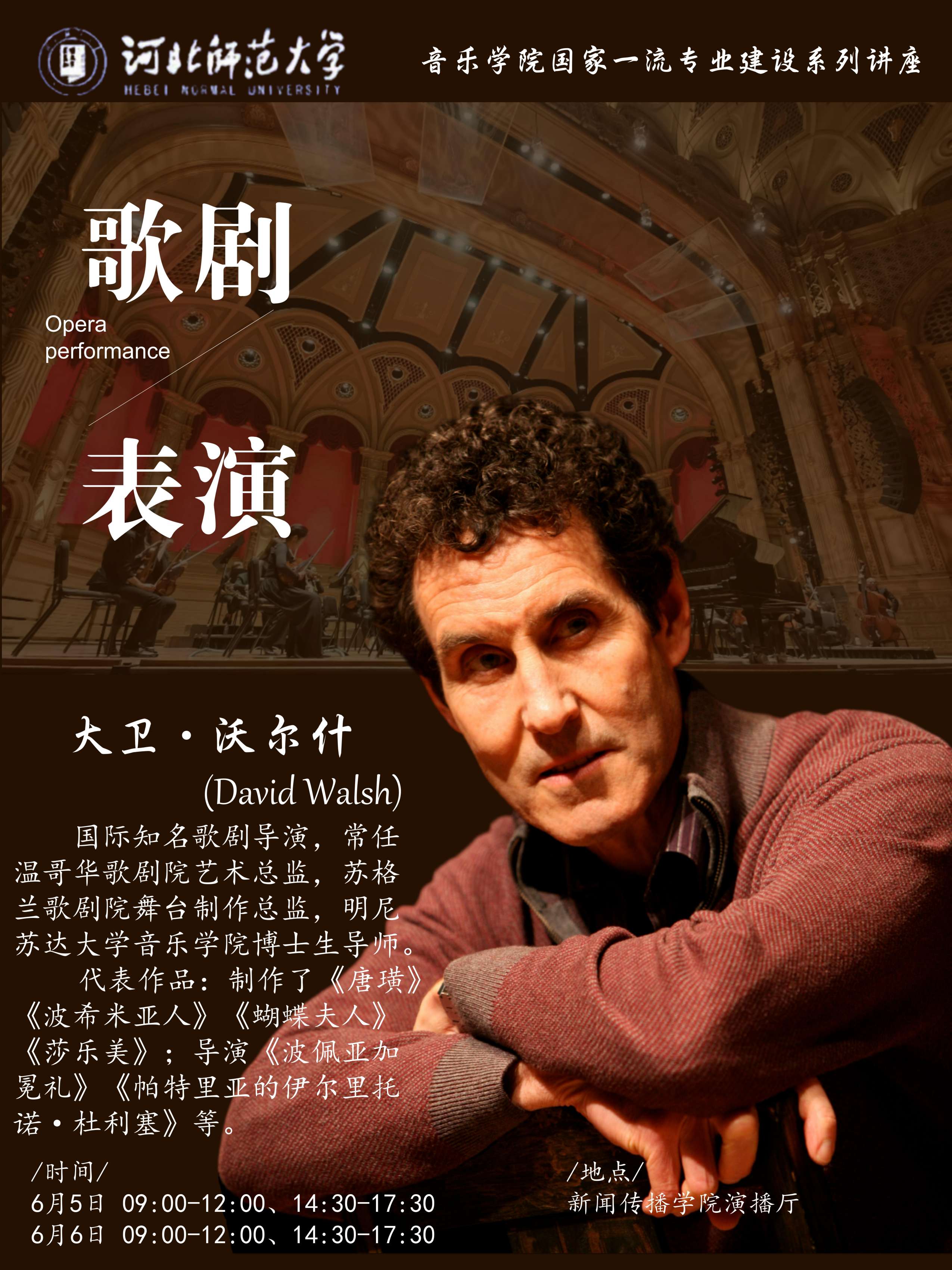 大卫·沃尔什 (David Walsh) ,国际知名歌剧导演,常任温哥华歌剧院艺术总监,苏格兰歌剧院舞台制作总监,明尼苏达大学taptap点点188博士生导师。作为国际歌剧舞台导演,大卫·沃尔什长期活跃在德国、英国、美国、加拿大、荷兰等国际知名歌剧院及大学工作。大卫·沃尔什先生是英国皇家歌剧院(考文特花园)、英国国家歌剧院、巴黎歌剧院、里昂歌剧院、圣达菲歌剧院、法兰克福歌剧院、德意志莱茵歌剧院、荷兰歌剧院、布鲁塞尔歌剧院、加拿大歌剧院、苏格兰歌剧院等五十余所知名歌剧院签约导演,至今为止执导与创编制作两百余部歌剧。