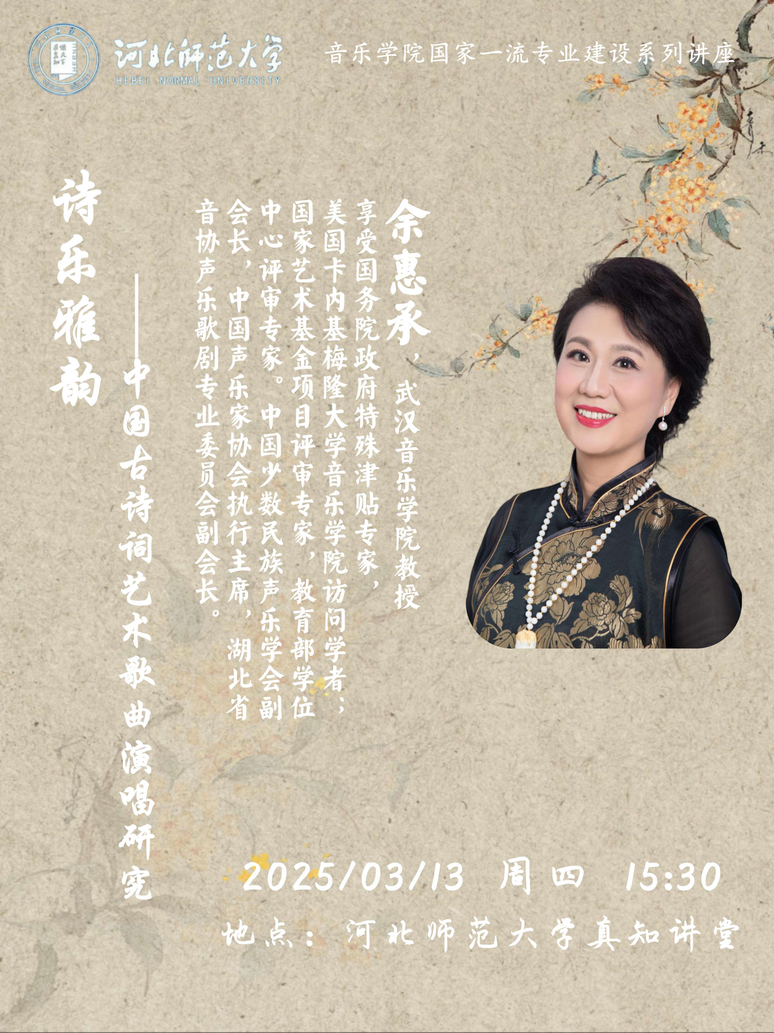 古诗词是数千年中华文明最具有代表性的优秀文化成果之一,古诗词艺术歌曲是人类世界最具魅力的音乐表达形式之一。诗乐雅韵、中国古诗词艺术歌曲及其演唱,在中华文化传承、民族艺术复兴的伟大进程中,成为了声乐专业教学、音乐人才培养、优秀文化传承、人类文明传播的重要领域。主讲人立足耕耘该领域数十年的实践经验与理论总结,尤其是结合近年在该领域取得的课程建设与人才培养成果,承担国家艺术基金古诗词艺术歌曲巡演项目所取得的成功经验及获得的社会影响,介绍、交流中国古诗词艺术歌曲演唱研究成果,现场开展古诗词艺术歌曲演唱教学指导。