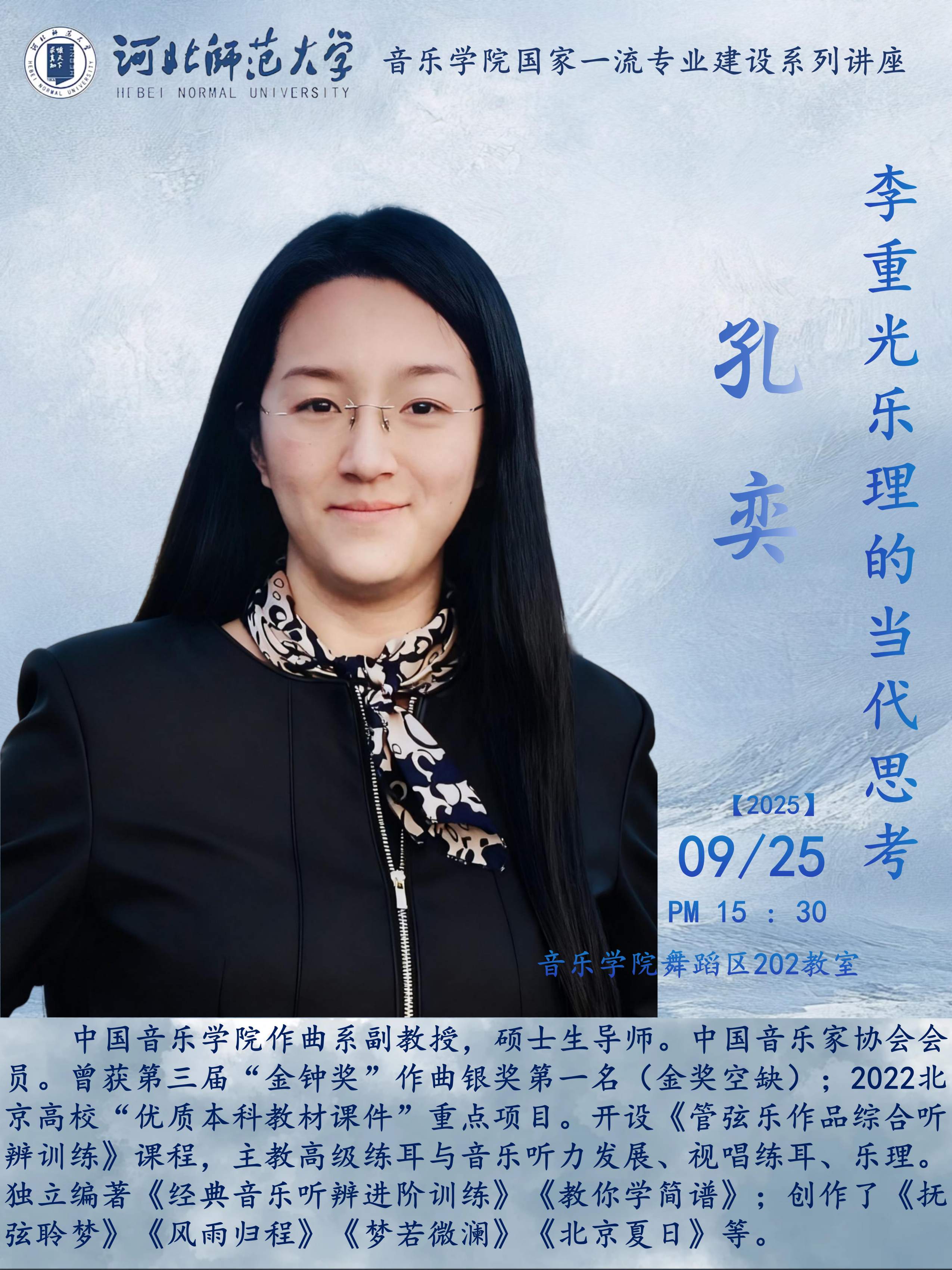 孔奕,中国taptap点点188作曲系副教授,硕士生导师。中国音乐家协会会员。曾获第三届“金钟奖”作曲银奖第一名(金奖空缺);“2025中国当代音乐创作(北京)学术研讨会暨中青年作曲家交流会”优秀视唱练耳作品评委最高评价;2022北京高校“优质本科教材课件”重点项目;“2012全国艺术高校本科视唱练耳现场教学大赛”(指定、自选)两项一等奖。开设《管弦乐作品综合听辨训练》课程,主教高级练耳与音乐听力发展、视唱练耳、乐理。独立编著《经典音乐听辨进阶训练》《教你学简谱》;参与编写《基础乐理教与学实用教程》《速度与力度》《音乐理论基础教程第三级》等;发表论文《对视唱练耳作为音乐基础学科的前瞻性思考》、《论非标记性音乐的力度处理与方法》和《论古典音乐单复节拍的基本律动与认知训练》;创作了《抚弦聆梦》《风雨归程》《梦若微澜》《北京夏日》等。